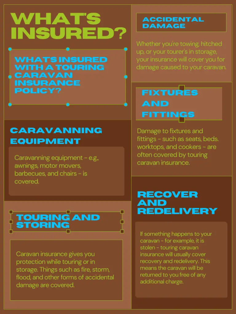 Everything included on the infographic above is what’s covered by your typical touring caravan insurance policy. However, what’s insured will differ from policy to policy. For example, some insurance policies will be more comprehensive.